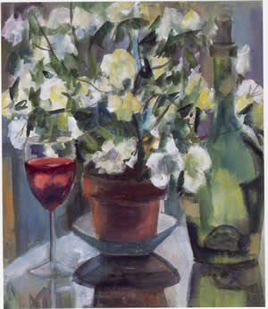 Im Winter, wenn es nicht mehr möglich ist, draußen zu arbeiten, konzentriert sie sich auf Stillleben oder malt das Haus des Nachbarn gegenüber. |